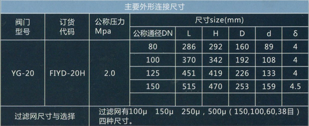 FI表示過濾器,Y表示結(jié)構(gòu)形式為直流式,D表示對焊連接,20代表公稱壓力為2.OMPa,H代表殼體材質(zhì)為鋼質(zhì)焊接。