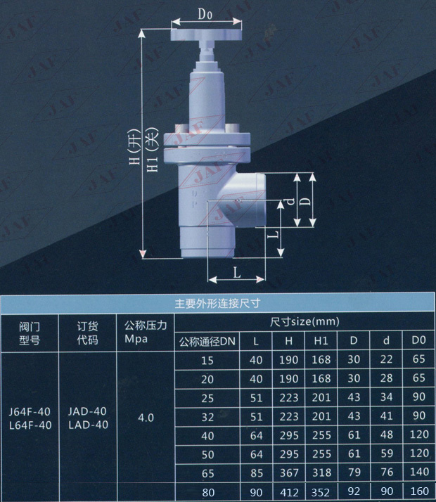 J表示截止閥 A表示結構形式為直角式 D表示對焊連接 40代表公稱壓力為4.0MPa 40后不標注表示閥體材質為鍛鋼。